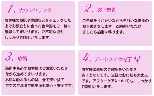 汗をかいても泳いでも、メイクした時に近い眉でいられるアイメイク方法で皮膚のごく浅い部分に色素を着色していきます。お客様の施術に使用いたします器具は消毒、お客様に触れるパーツは全て使い捨てさせてい ただいておりますので安全で衛生的です。生活環境や肌質などにもよりますが、半永久的に保つこともできます。お客様のご要望に丁寧かつ誠実に対応し、ご納得いただけるまで十分なカウンセリングを行いますので初めての方でも安心して、ご相談ください。